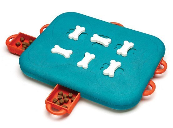 Węsząc i pomagając sobie łapą lub pyszczkiem pies natrafi na szufladki, które będzie musiał odblokować, zanim sięgnie po ukryte łakocie. System zamykania/otwierania polega na obróceniu kosteczki znajdującej się na wierzchu. Sprawdź czy Twój czworonóg jest geniuszem!